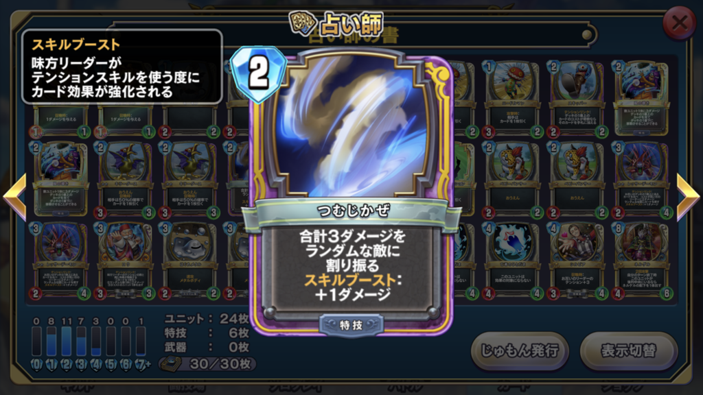 つむじ風はミネアのテンションスキルで持ってくるとコストが1になるので、相手の盤面に何もいなければ1MPで7点とかのカードになるわけです。メラゾーマが4MP5点のゲームで、ですよ。開発の人はつむじ風を一体なんだと思ってるんでしょうか。